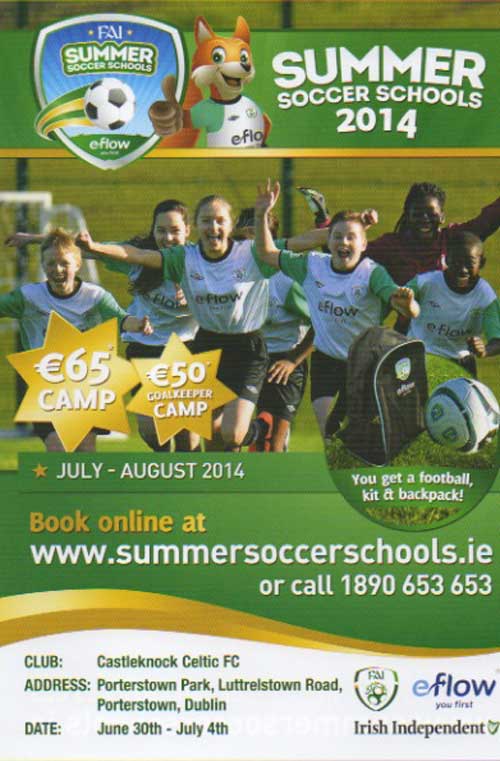 Click for more information on the FAI Summer Soccer Schools 2014. Remember the first 5000 online bookings will receive a free adult and child ticket to an international soccer match at the AVIVA stadium. The link above takes you to where you can get onto registering for the camp.