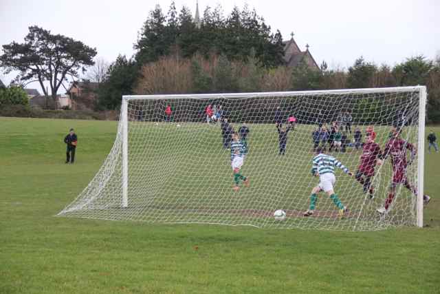Minutes later Catre nearly made it four when latching onto a Regan through ball and seeing his left foot drive edge past the right hand post. Worse to happen as Cloghertown were reduced to 10 players following injuries to two of their team. Three up and cruising but this became the problem as all of the players seem intent on getting on the scoresheet leading to the midfield getting too far forward. In turn this lead to the defence being exposed which allowed Cloghertown in for a soft goal in their first attack of the half. 3-1.