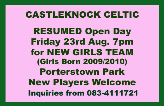 Training Session for New Girls Team being formed. Takes place FRIDAY 23rd August at 7pm. Girls Born 2009/2010. New players welcome to attend.