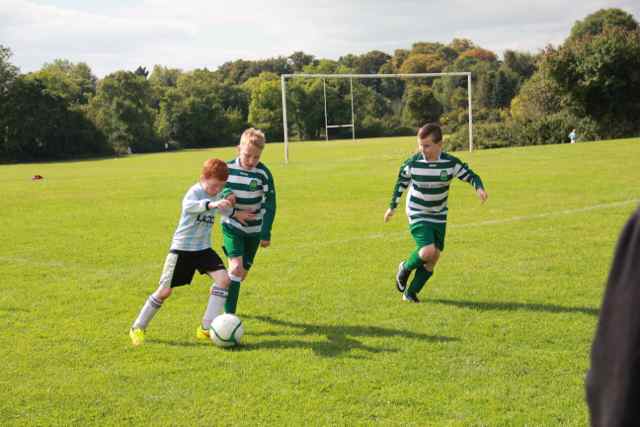 What a fantastic way to start the 2014/15 league campaign. It was beautiful sunshine in Porterstown and two fantastic teams did battle in this U-10B1 league match. Glasnevin started really well and had flair in their passing game and troubled our defence on numerous occasions. Playing up the hill against the breeze meant most of the pressure was on our defence with Dylan and Finn being called on to clear the lines. The Glasnevin passing game was difficult to get a grip on and they scored a fine goal after 12 mins. However eventually the midfield started to click and gain possession. We were very dangerous on the break, as Frankie, Guy, Michael and Calum broke forward on numerous occasions. We finished the first half much the stronger.