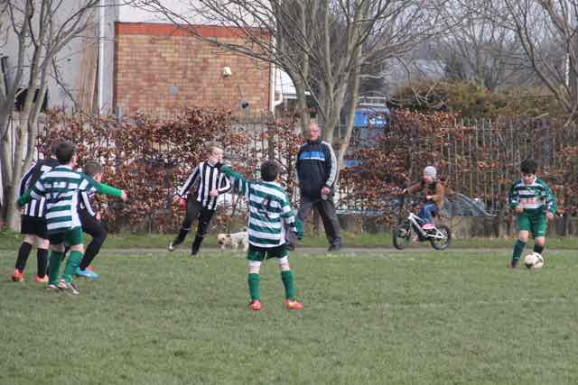 James Whooley was again influential, after scoring 2 goals in the previous game. He kept a clean sheet today in the first half, but in truth he did not have a lot to do, apart from one superb save when he pushed the ball around the post. Having done the job in goal, he was to play an even bigger role in the second half when he moved outfield. One reason he had little to do was a superb performance by Dominick Odujebe who covered almost every blade of grass and hardly missed a tackle throughout. He was ably assisted by Andrei Ungureanu who was never far from the action, clearing the ball at one end and getting shots in at the other. Ronan Wells did a fine job in defence beside Dominick, and he moved upfront in the second half to lend his weight to the attack. Calum Daly had a roving role in the middle and gave his usual committed performance, putting in some solid tackles. It was end to end from start to finish, and the teams ended the first half all square at 0-0.
