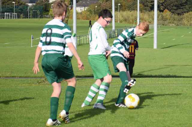 Today sickness and injury reduced Celtic’s panel to 10, but it did not blunt the sharpness of the side. Almost from the start, Celtic were on the front foot. Patrick O’Reilly was making menacing runs at the home defence. His early effort missed the target, but on 5 minutes he smashed his shot past the Cabinteely net-minder. Cabinteely did manage to keep the Celtic attack quiet for the next 10 minutes. Brierton Murphy and Dennis Diac swapped passes before Thomas Bolton raced toward the opposition box, only to be taken down at the expense of a free kick in a dangerous position. Thomas hit the free from 20 metres into the top corner, and Celtic had some breathing space. Michael Kelly’s effort on goal was blocked and the score remained 2-0 to Celtic at half time. Michael showed many delicate touches throughout the game, dinking passes through opponents.